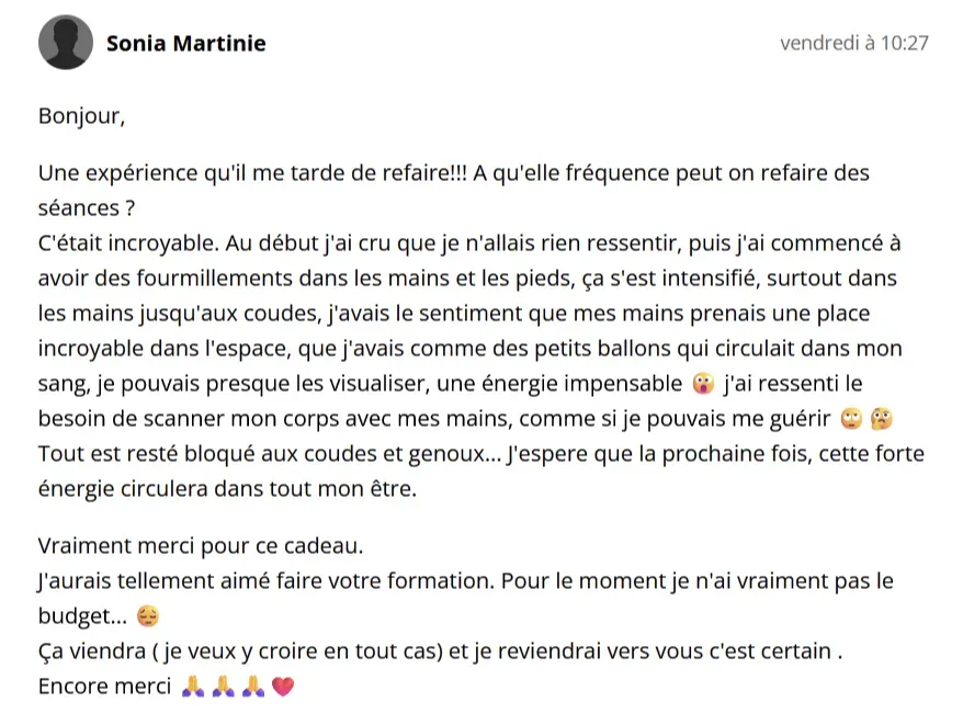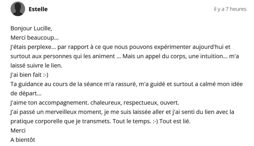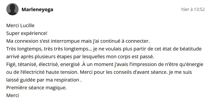 Chaque session est unique et différente. L’expérience peut être subtile ou très puissante, elle peut être physique, émotionnelle, énergétique, il peut y avoir des prises de conscience. Elle montre toujours quelque chose de nous à intégrer.